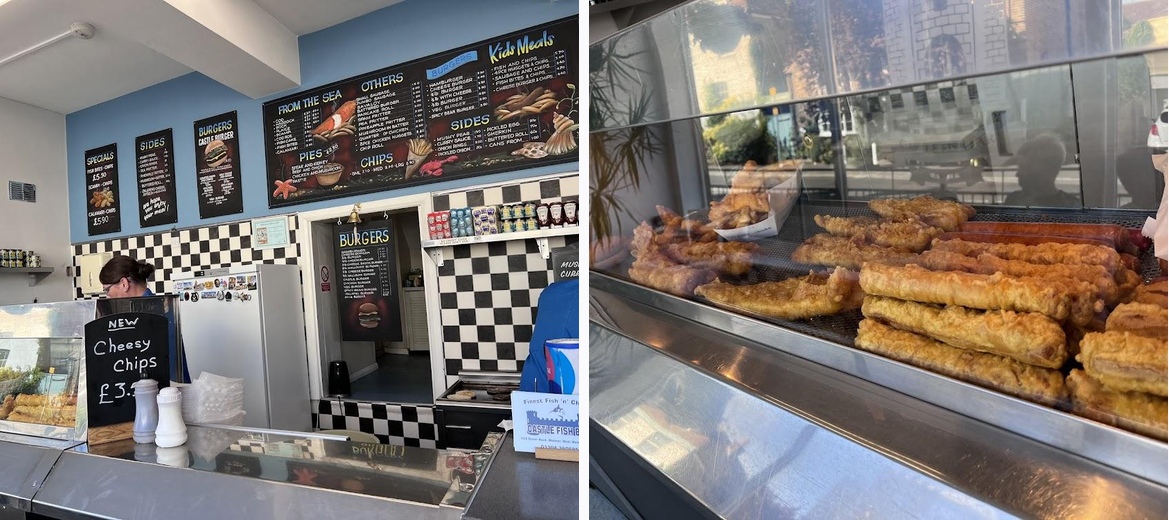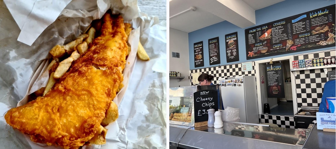 Absolutely loved grabbing our dinner from Castle Fish Bar. They had a wonderful menu with plenty of options for the entire family. We couldn’t decide and ended up ordering a sampling of different fish, hamburgers, chips and they staff was kind enough to give my kids some treats. Super friendly staff. No seats available so we took the food down to the beach and had our dinner there. This is a great spot.